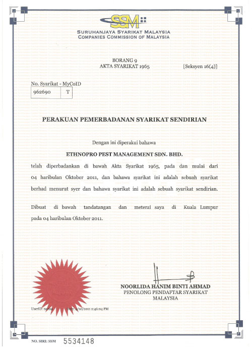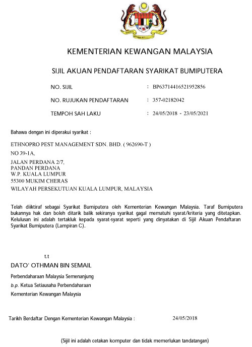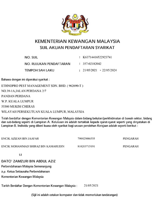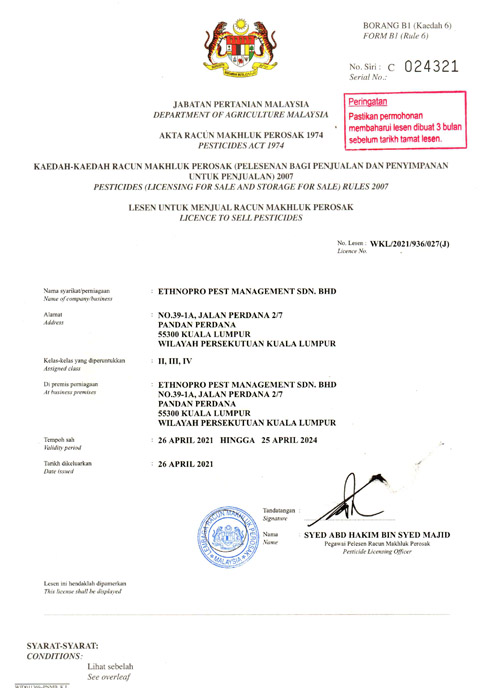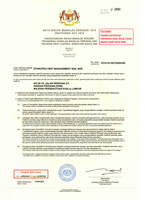ETHNOPRO Pest Management Sdn. Bhd. Is a Licensed fumigator (by the Ministry of Health, Malaysia), having professionally trained and widely experienced pest management professionals and technical knowledge necessary to correctly identify pest problems and recommend the most responsible integrated pest management treatment available.